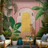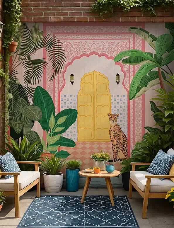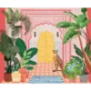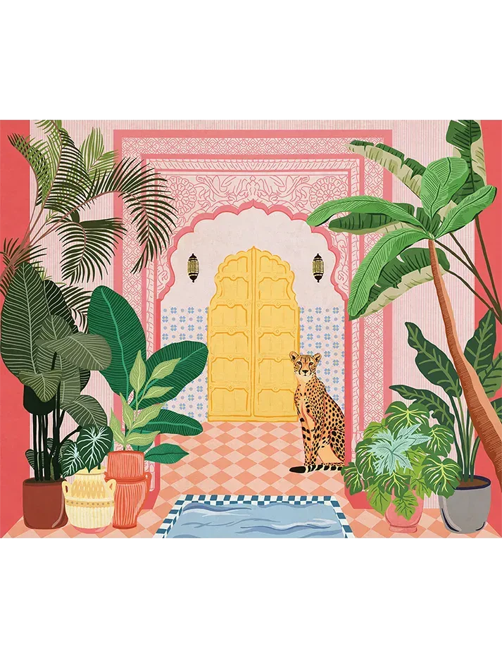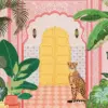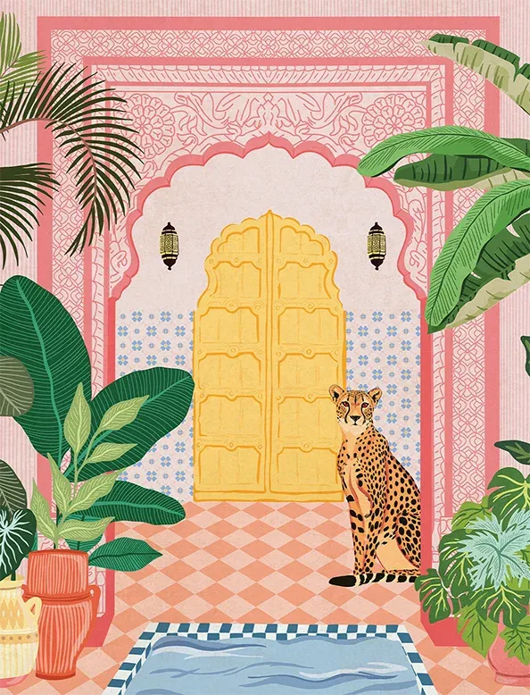 A contemporary composition featuring a sleek cheetah, stylized doors, and scattered greenery – a bold, modern design that blends structure, movement, and subtle natural accents.