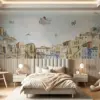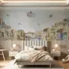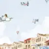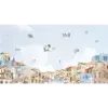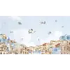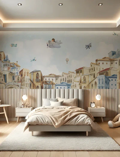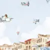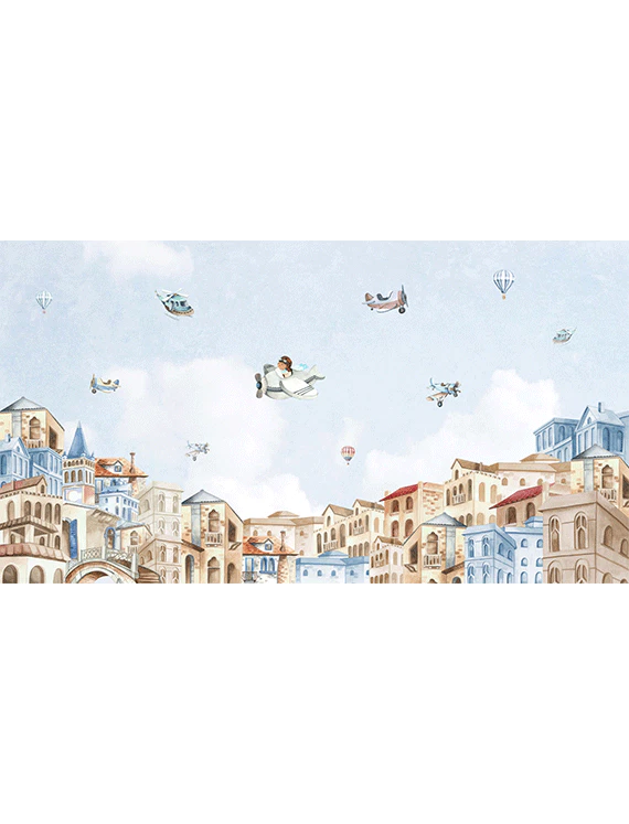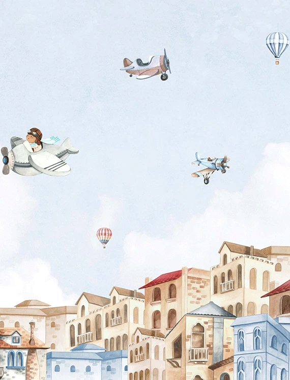 Mini aviators and vintage planes zoom above a charming old-town skyline, with rooftops bathed in warm tones and balloon dots in the sky. Soft clouds and whimsical characters add storytelling delight. This lively, uplifting wallpaper brings a retro-travel vibe to the room—full of motion, imagination, and big-sky dreams.