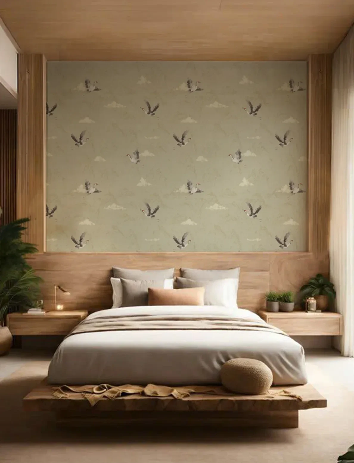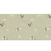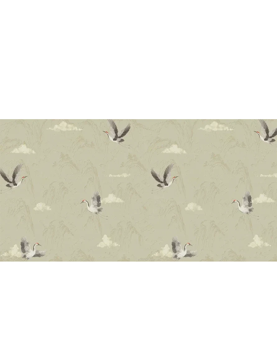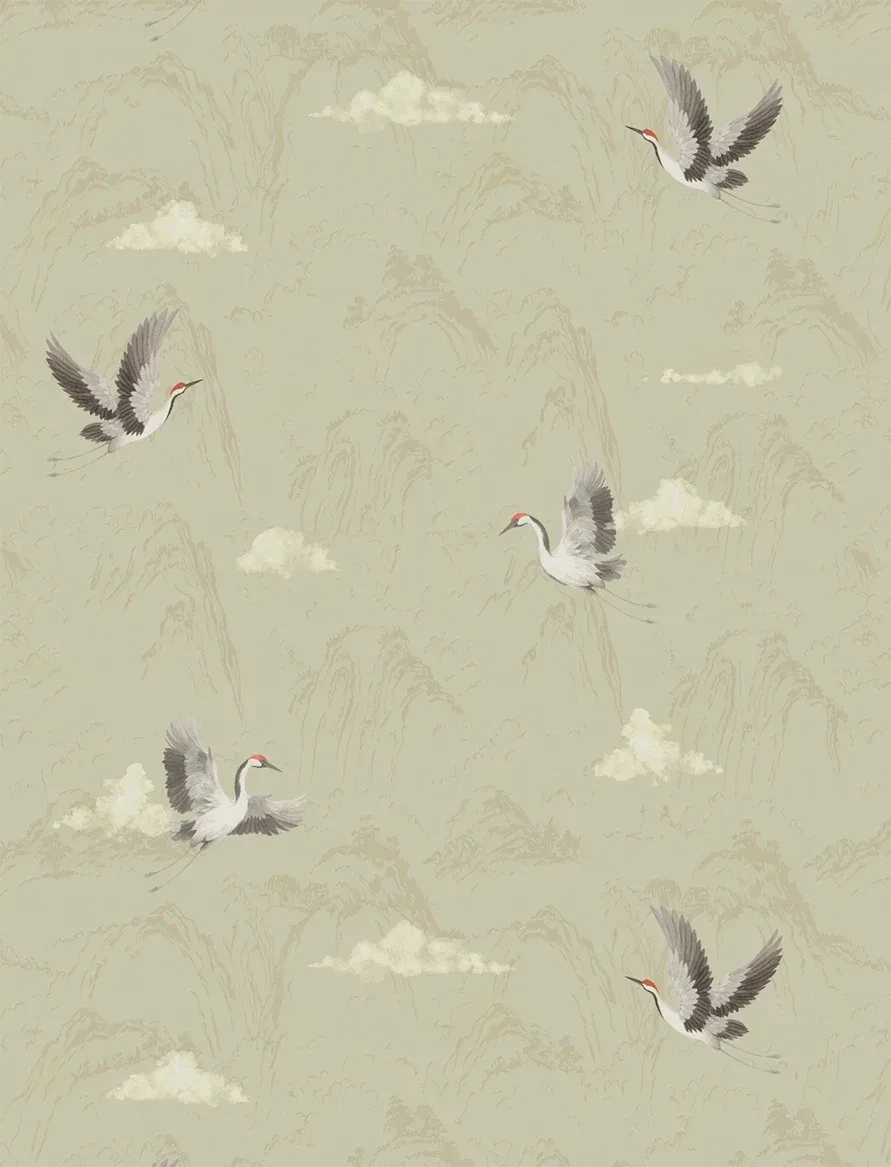 Storks soar gracefully against a minimal mountain backdrop, evoking calm and quiet movement.
