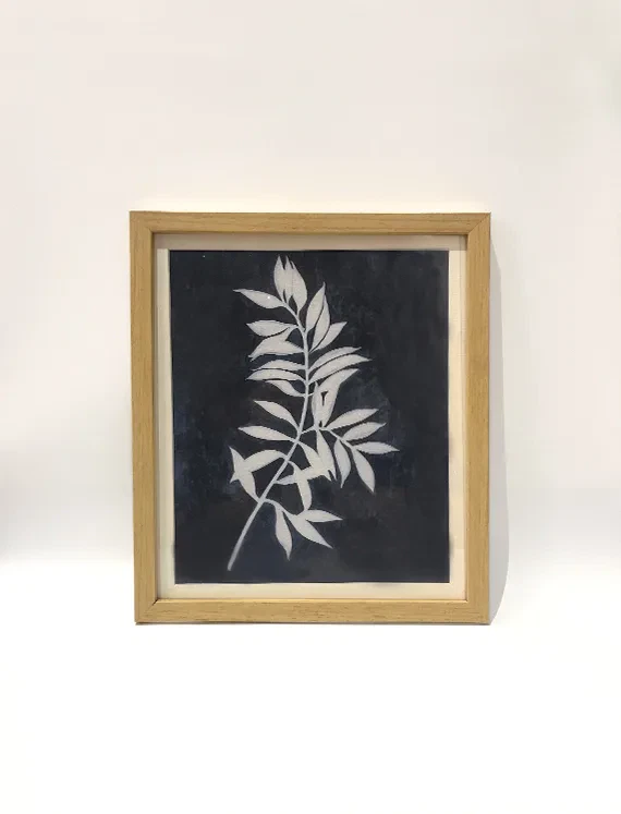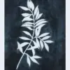 Graceful leaves in white silhouette on a textured blue background — a minimal yet striking frame for serene, nature-led styling.