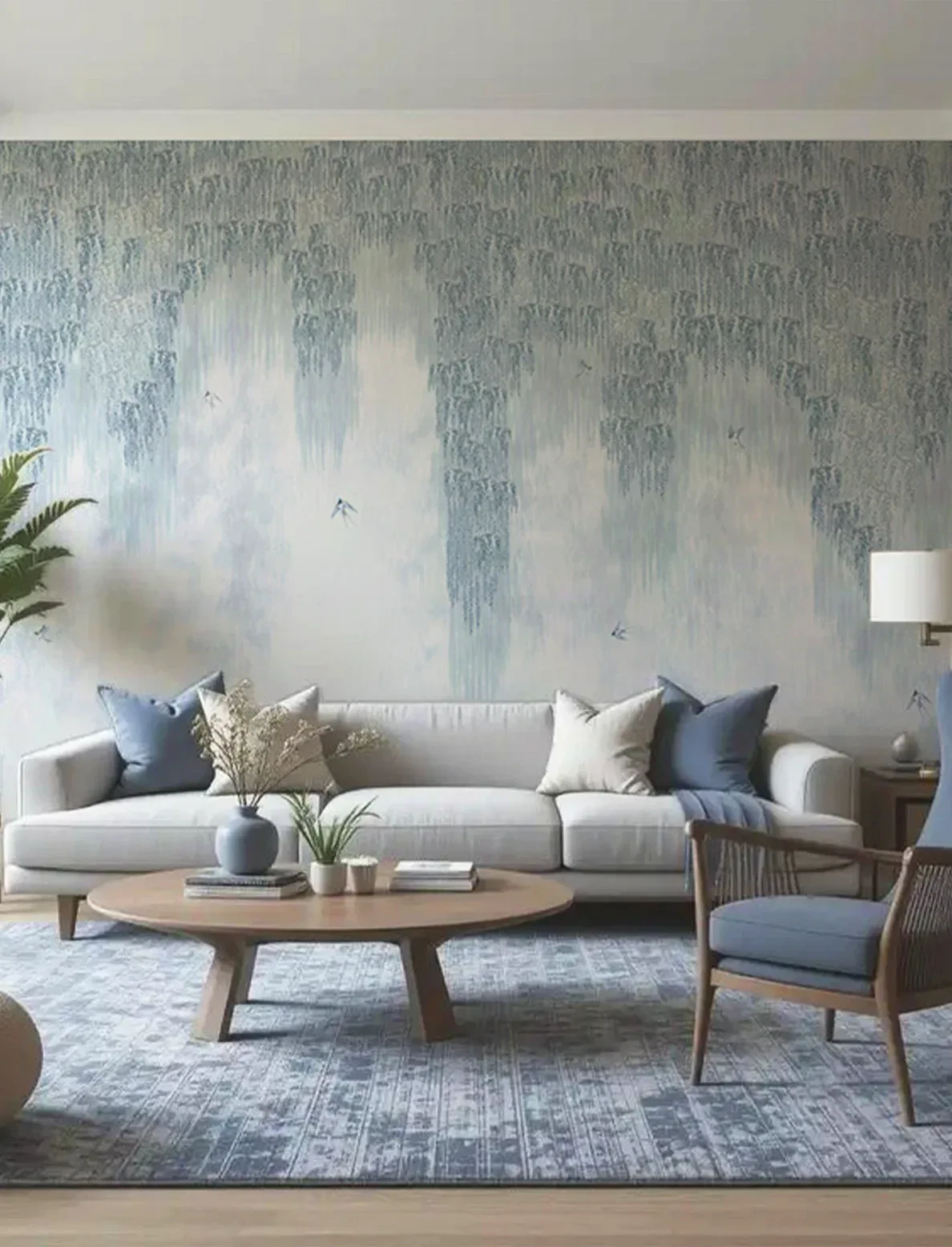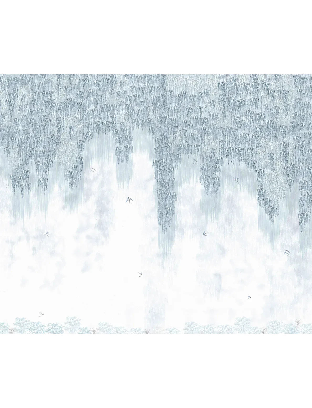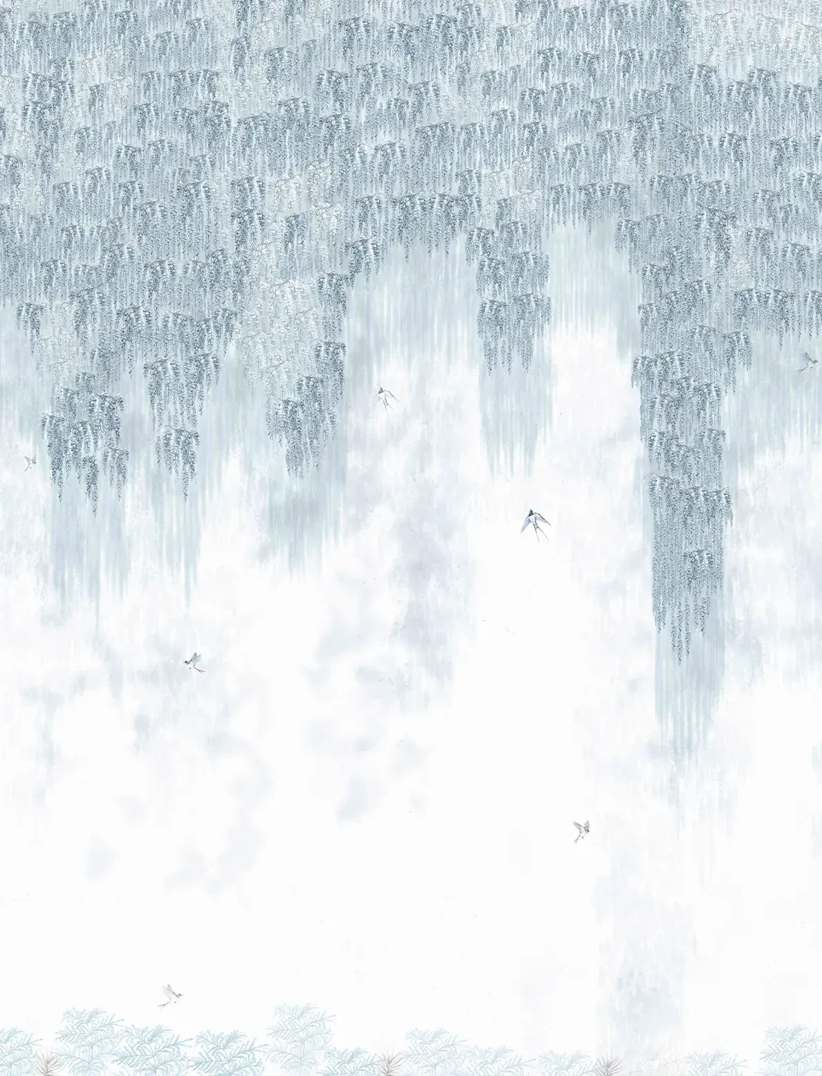 A finely detailed wisteria and bird mural that cascades in soft, graceful layers – creating a poetic scene filled with movement, charm, and quiet elegance.