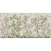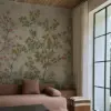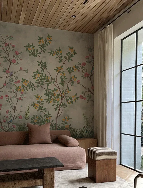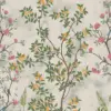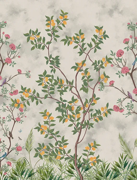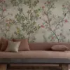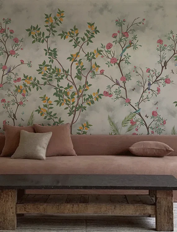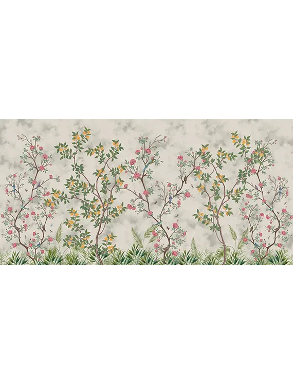 This wallpaper brings a garden to life with vibrant flowers, tiny sparrows, and earthy green bushes layered over graceful branches.