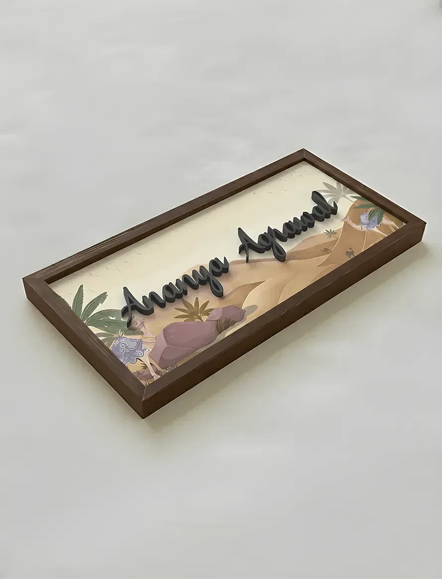 Echoing the golden sands of a distant oasis, this nameplate features an enchanting desert landscape with graceful camels traversing the dunes. Warm earthy tones and minimal yet intricate detailing bring a sense of calm, evoking the poetry of Arabian nights and the mystique of nomadic journeys.