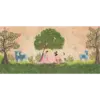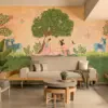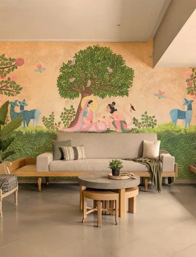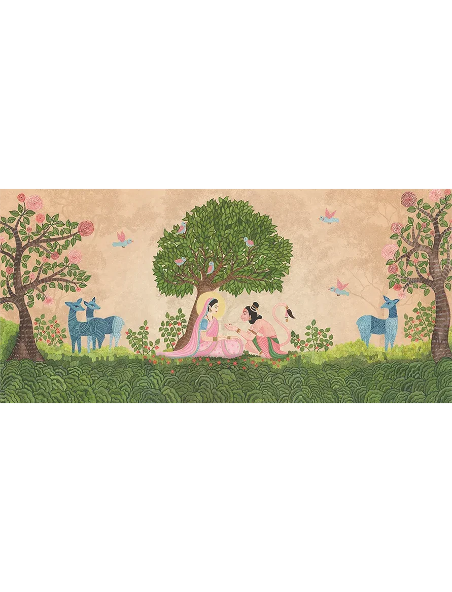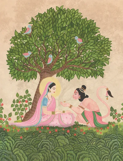 This artwork beautifully reimagines the mythical meeting of Sita and Hanuman in Ashok Vatika. The palette evokes a a mood that is at once tender, spiritual and timeless