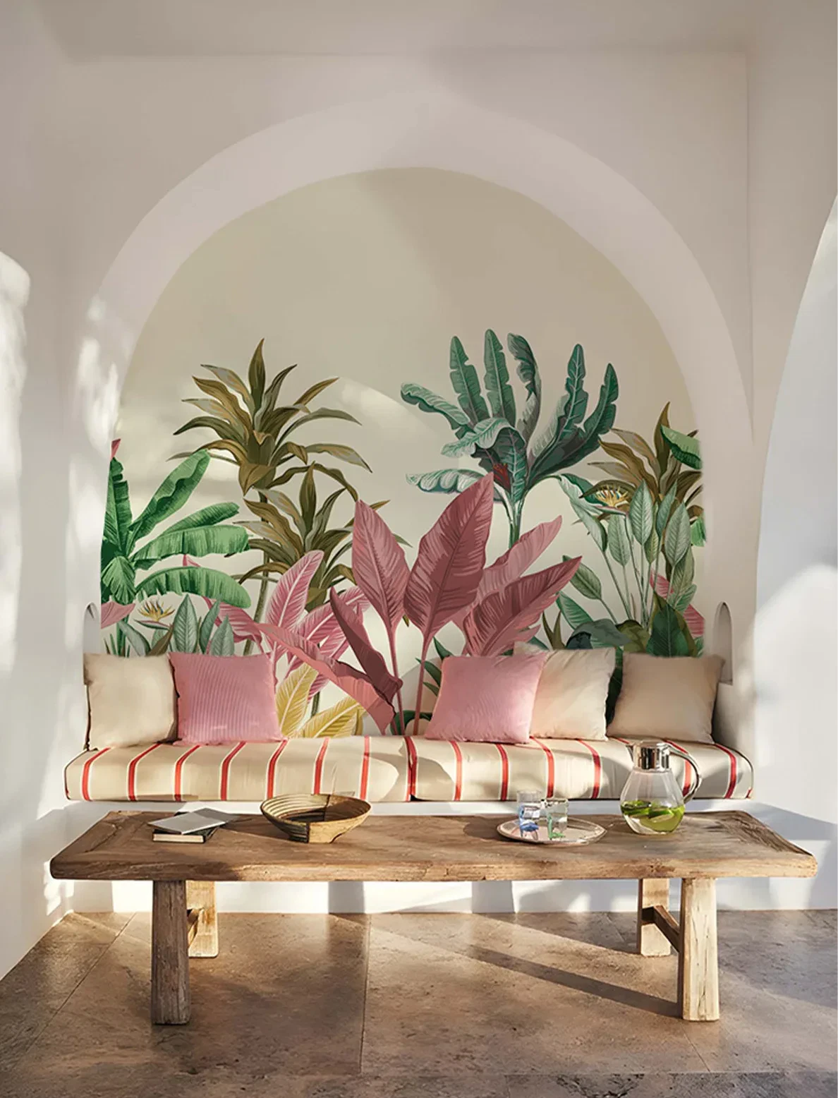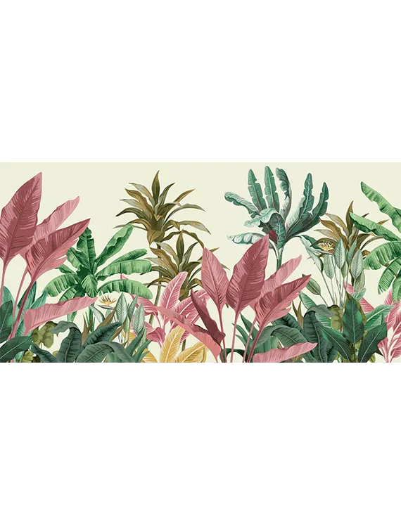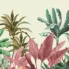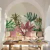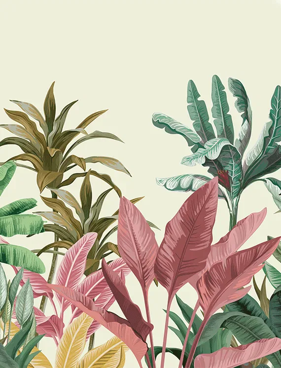 Vintage flair meets tropical vitality in this calming yet colorful wallpaper, offering a daily dose of nature’s uplifting beauty.
