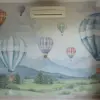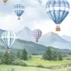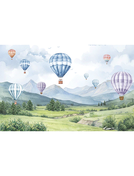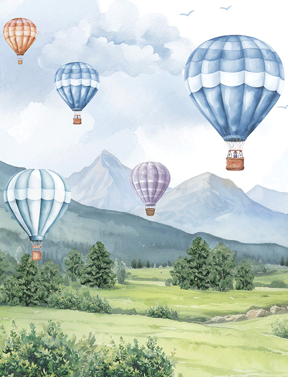 Float among the clouds with candy-colored hot air balloons drifting over peaceful mountains and fields. Birds soar alongside, and soft skies stretch forever. This watercolor-style wallpaper offers a gentle, dreamy atmosphere, great for inspiring wonder. It gives the room an airy, light-filled look, perfect for quiet time or creative thinking.