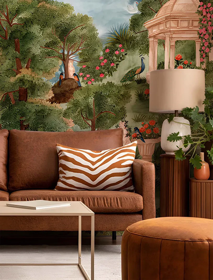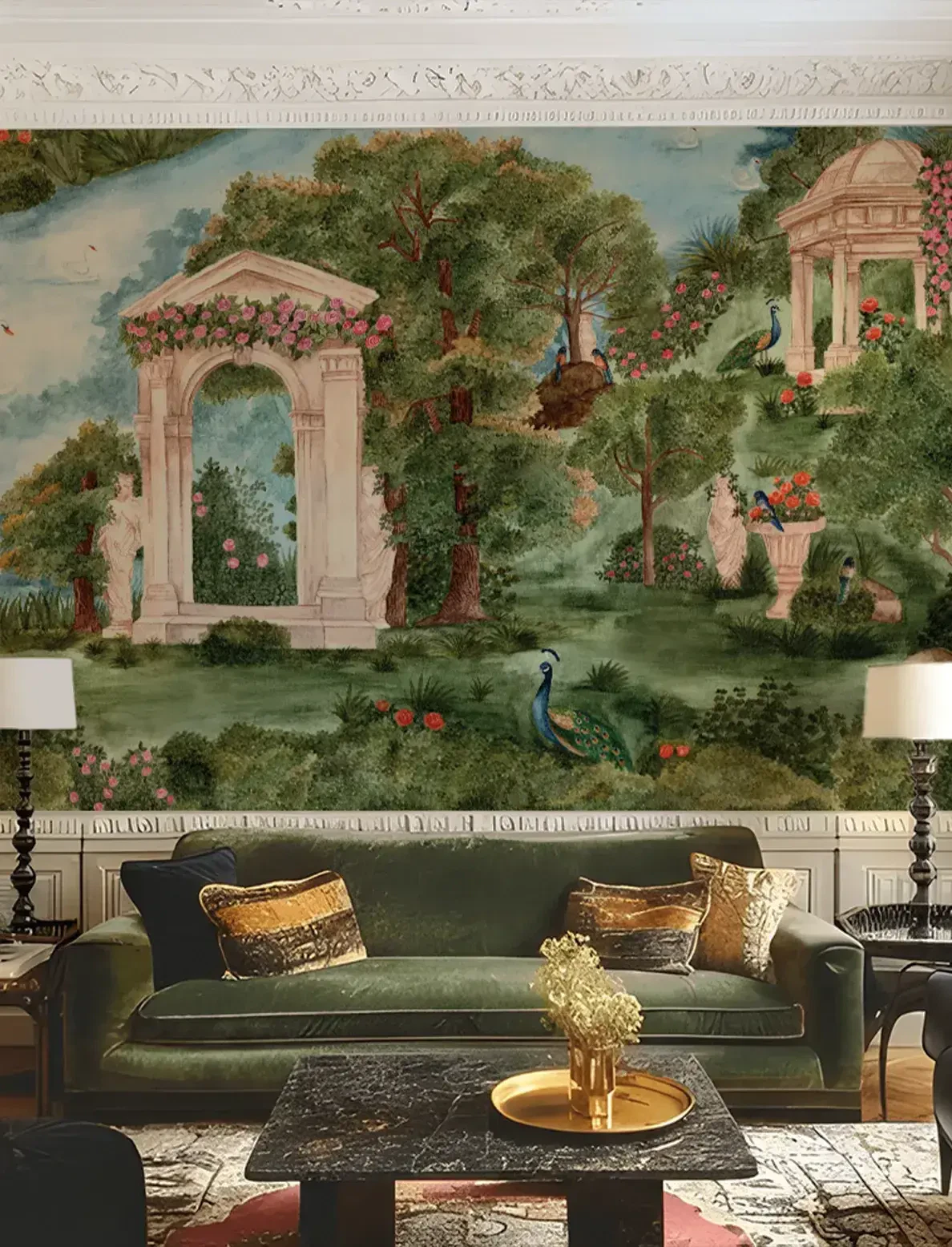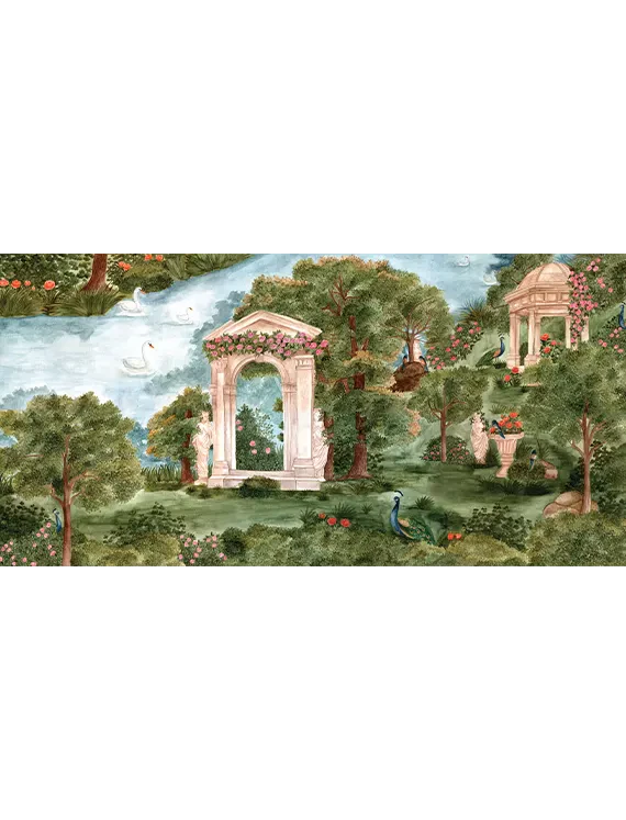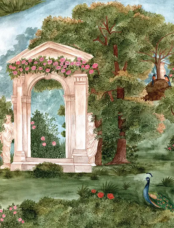 A romantic escape into a classical garden, this wallpaper creates a calming, sophisticated ambiance full of grace and charm.
