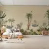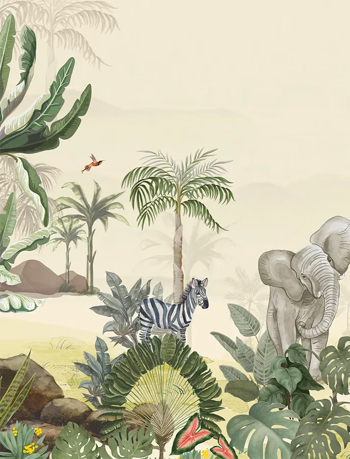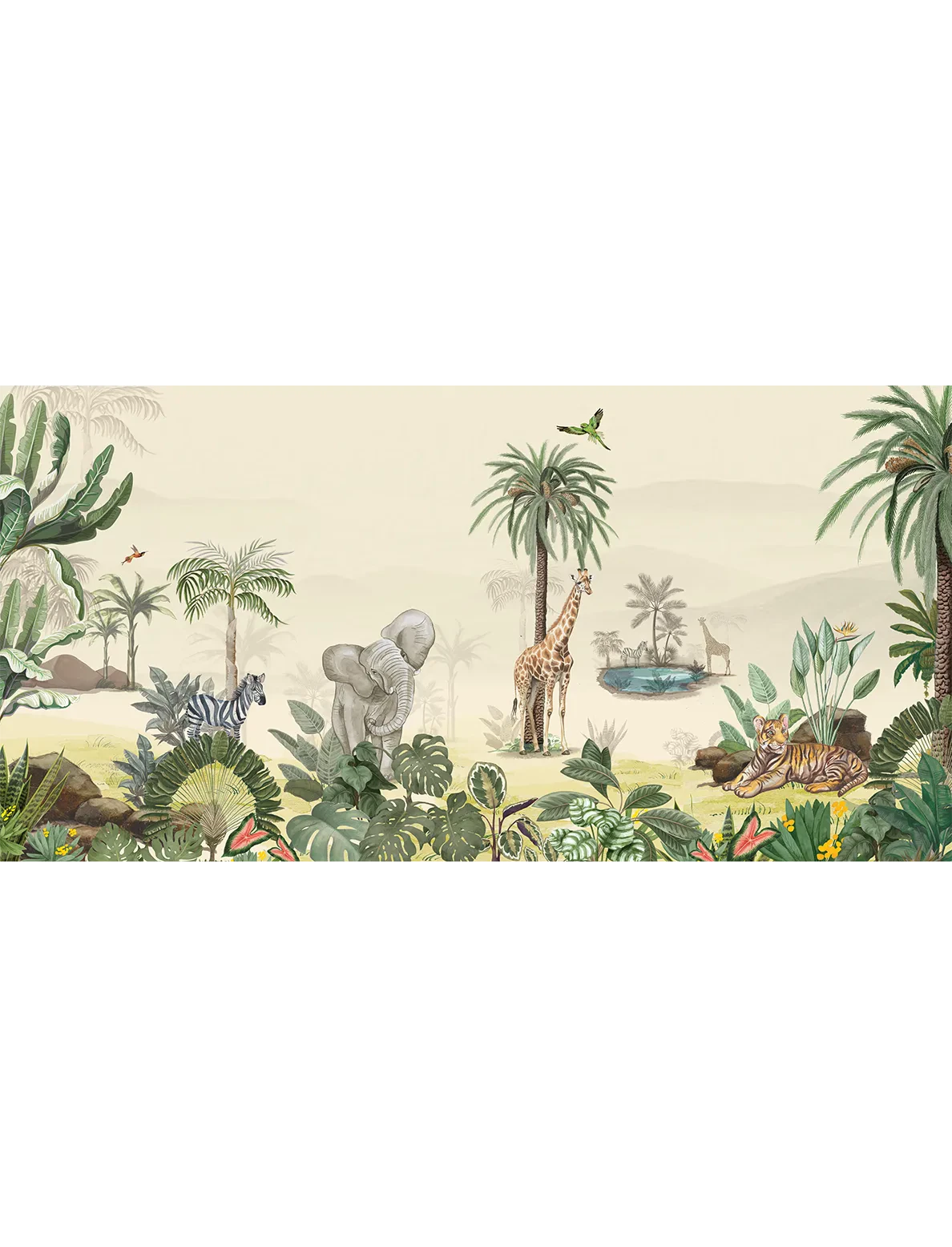 Venture into a lush jungle filled with elephants, giraffes, zebras, and vibrant birds. Palm trees sway, butterflies flutter, and a serene watering hole invites curiosity. This detailed scene sparks discovery with every glance. A perfect pick for animal-loving little ones, it transforms the room into an adventurous, nature-inspired haven.