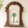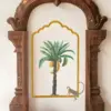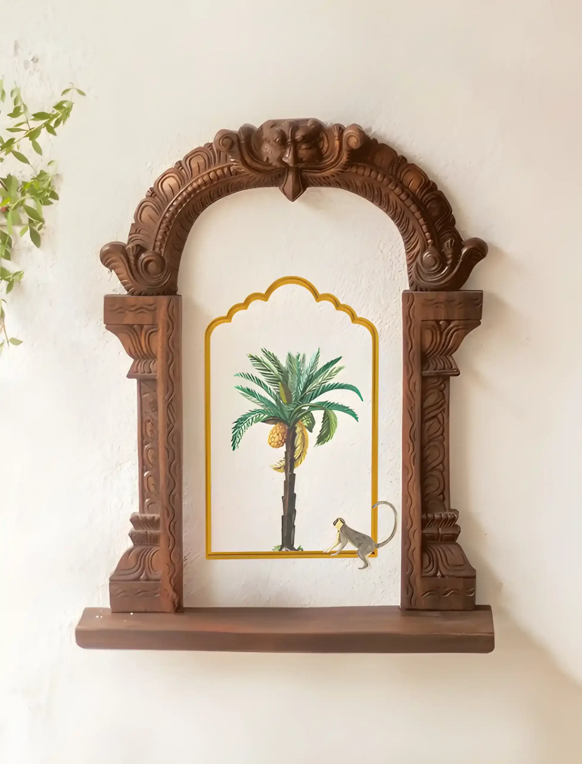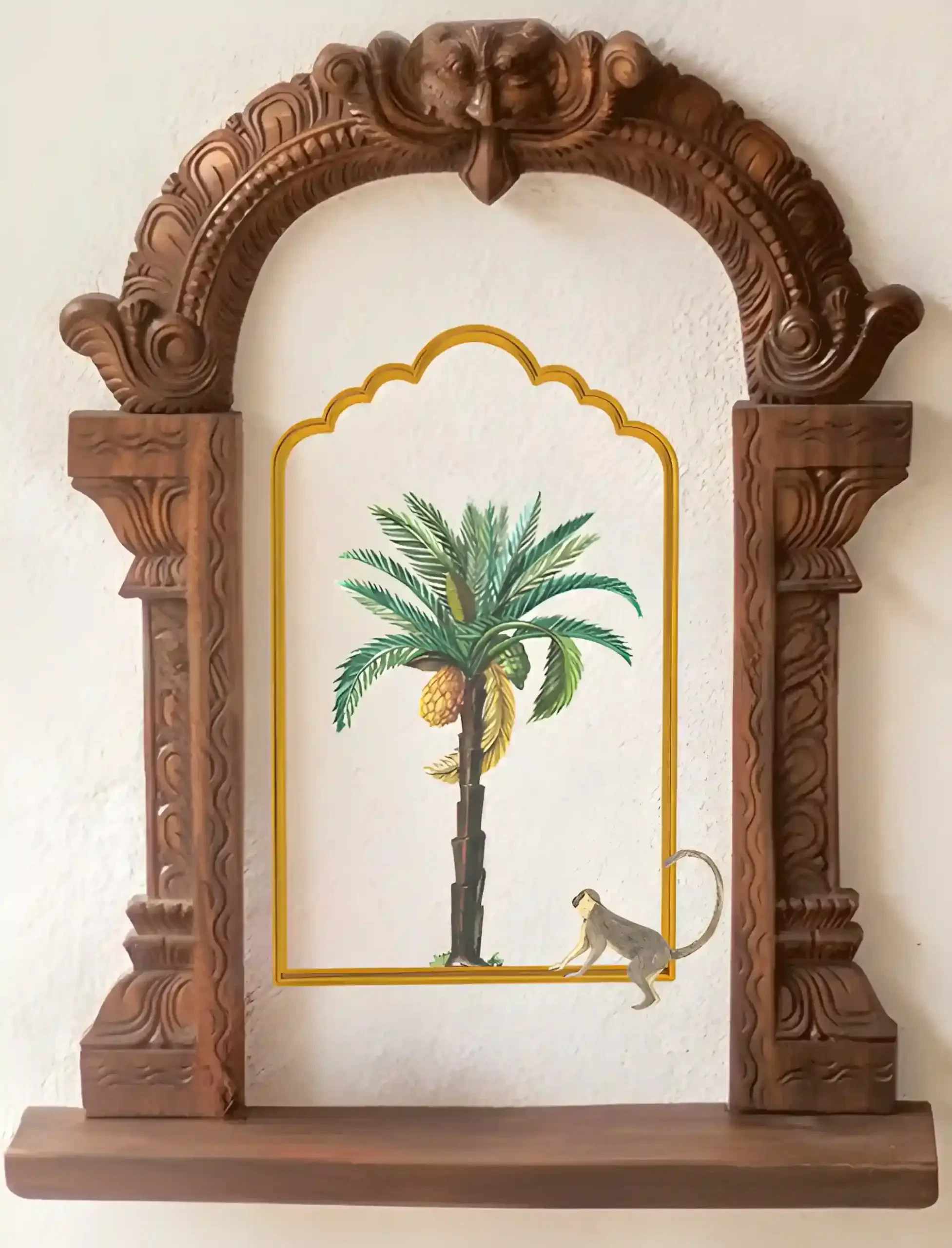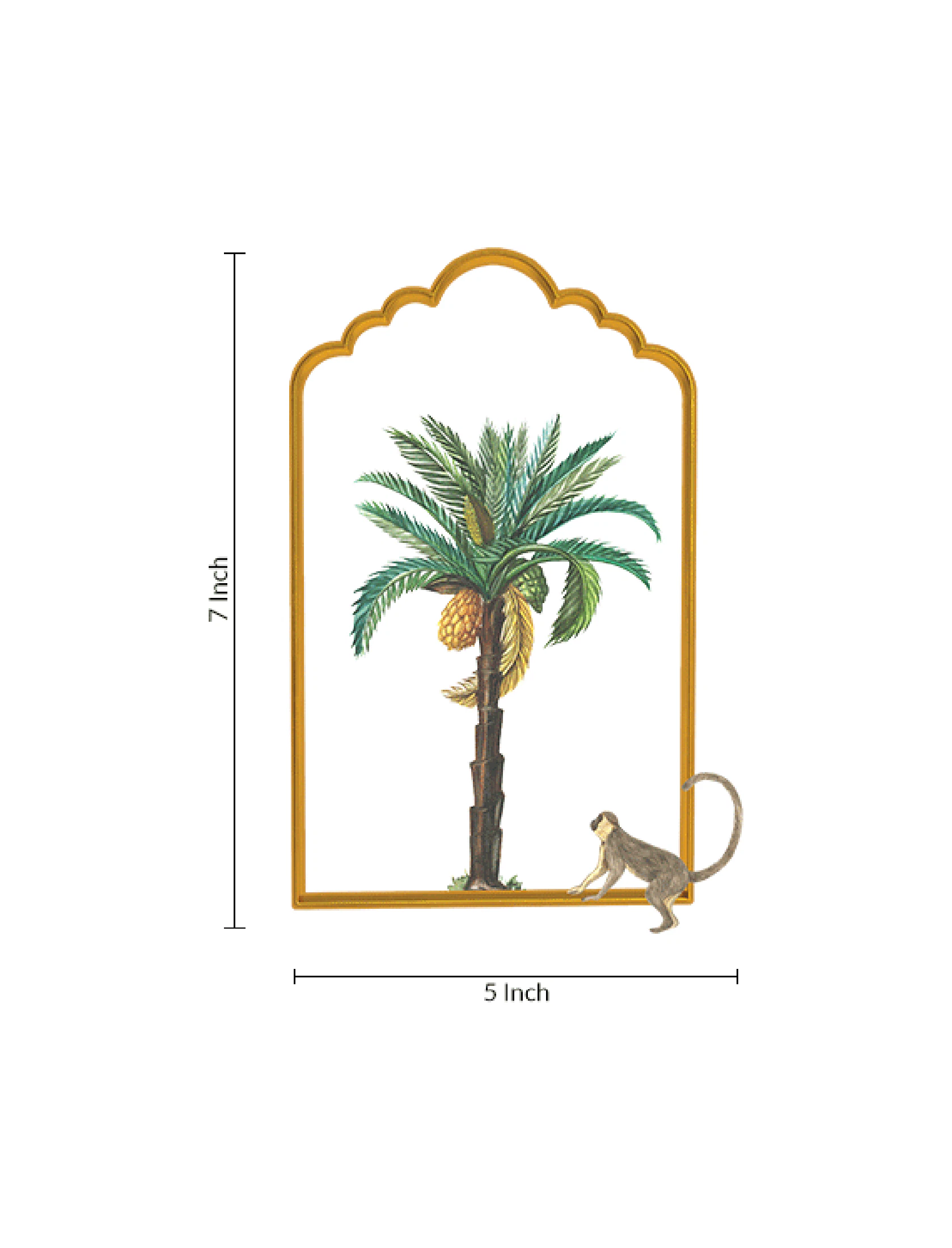 A playful monkey explores the view beneath a fruiting palm, framed in classic architecture — a whimsical decal full of story and movement.