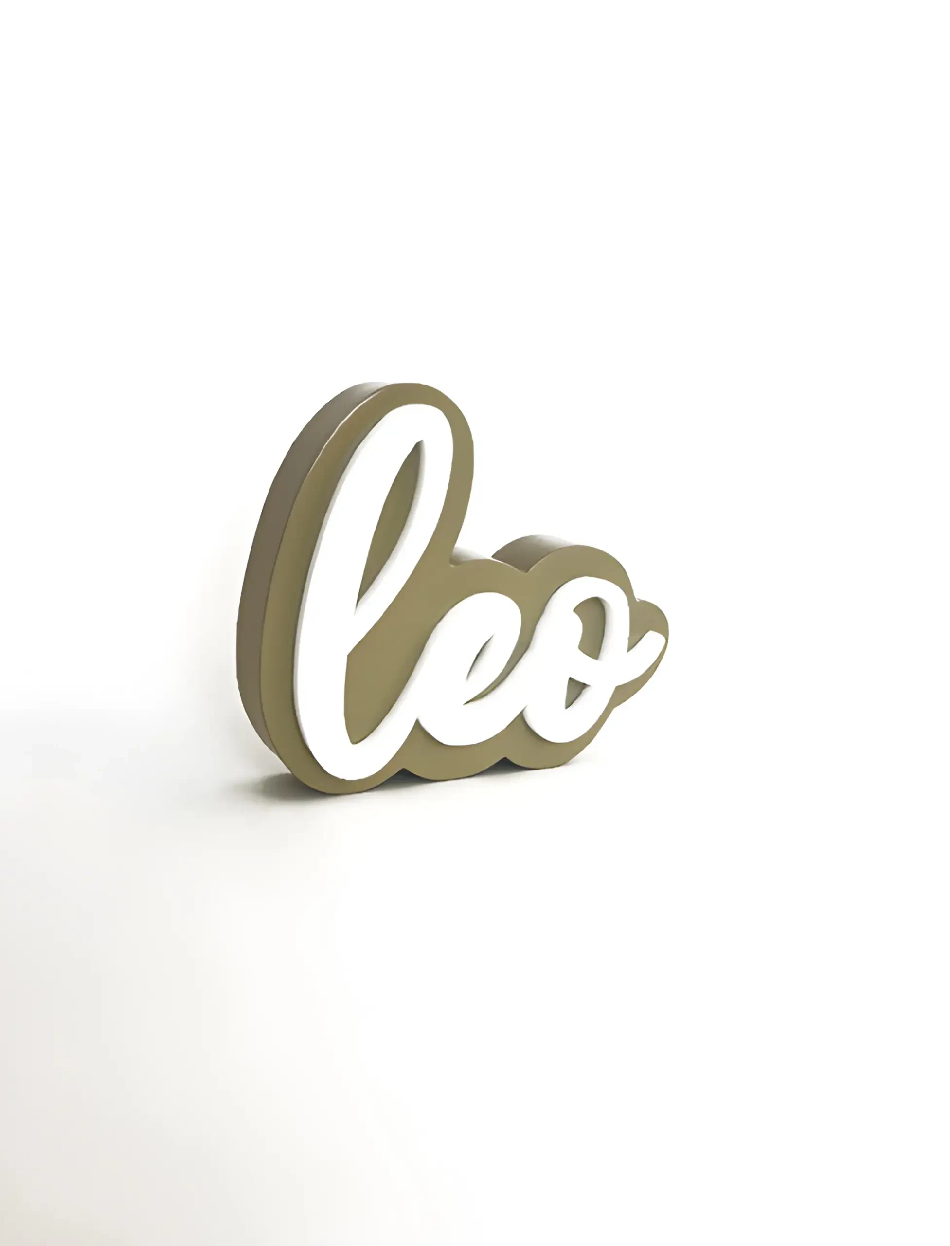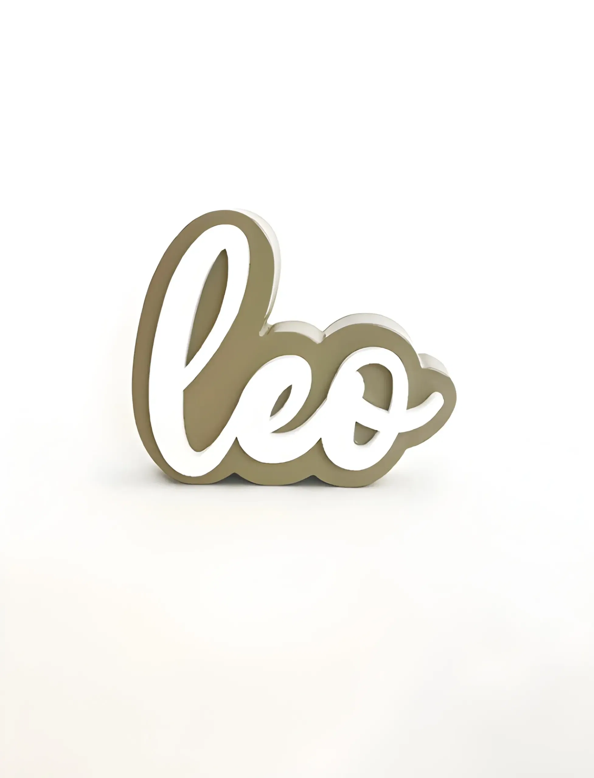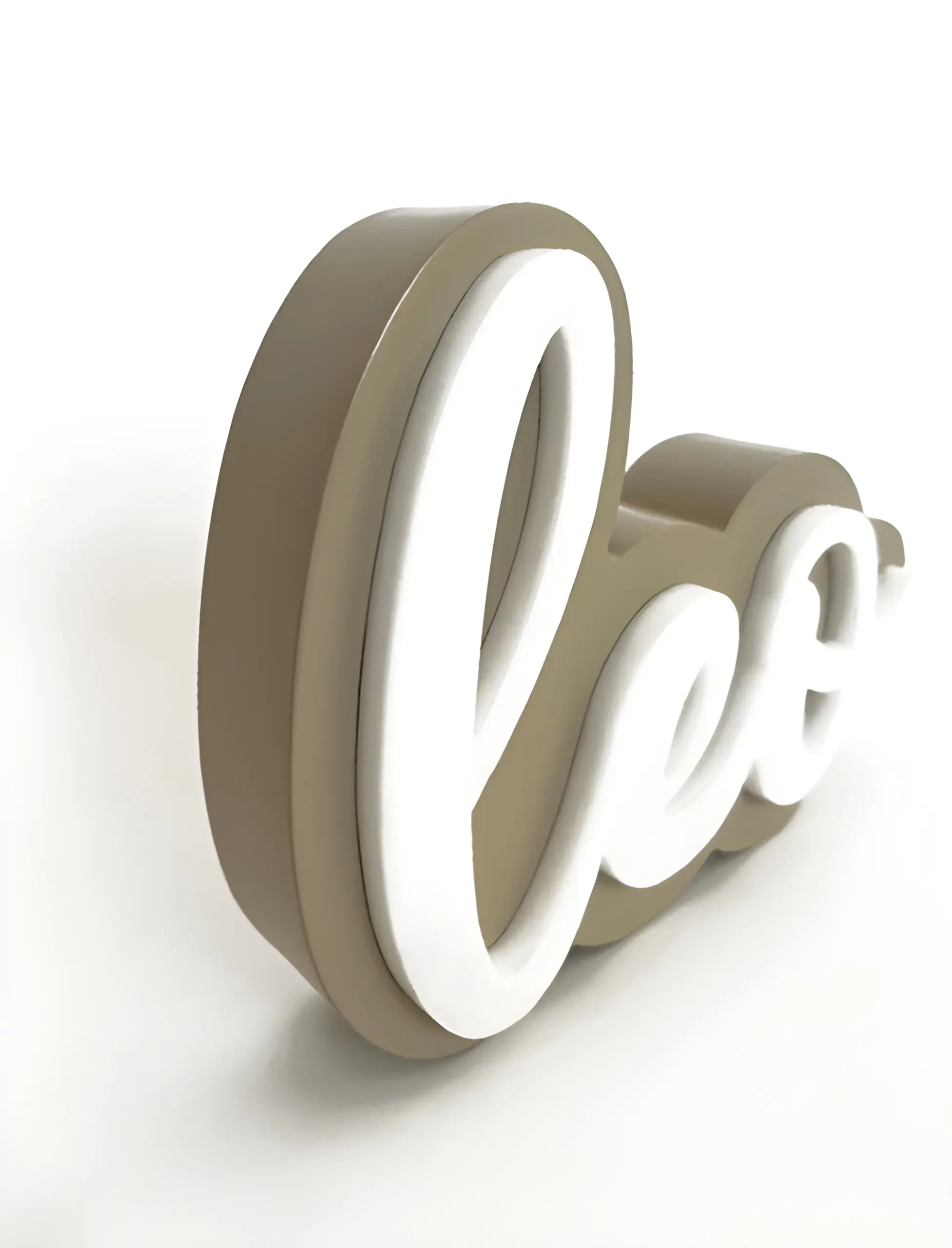 Laser-cut acrylic letters are used for a clean, modern aesthetic with a tactile dimension