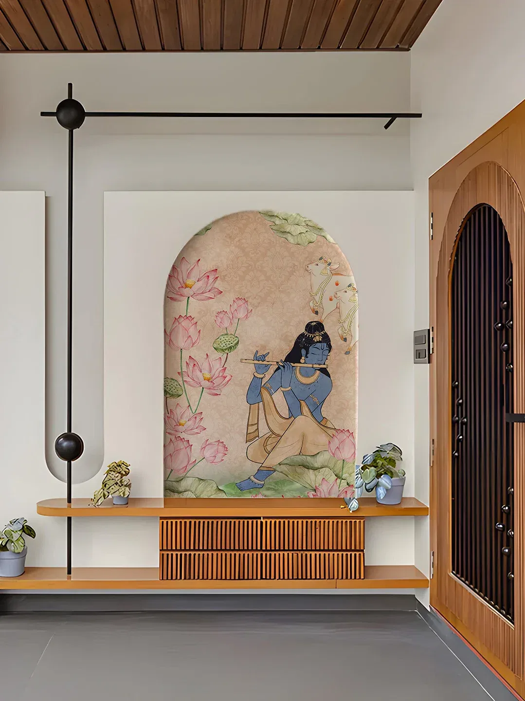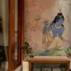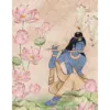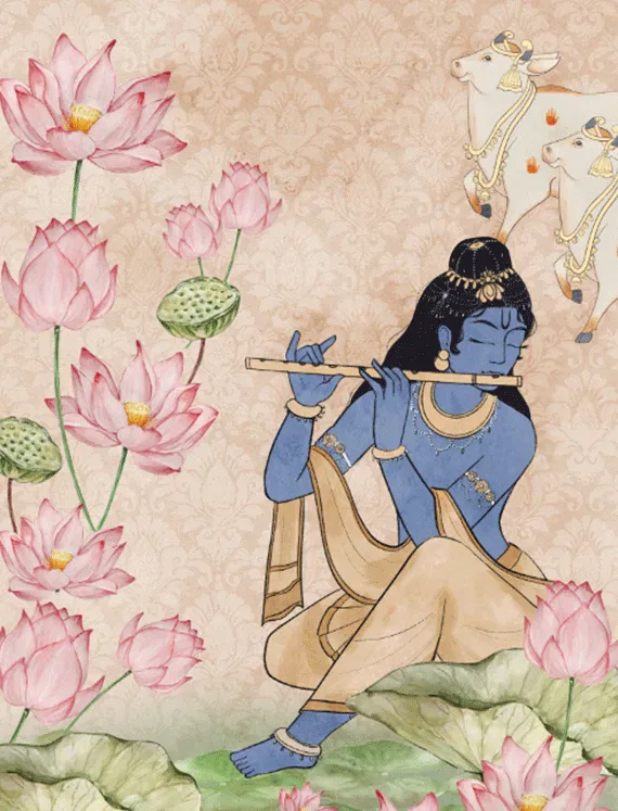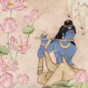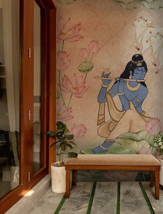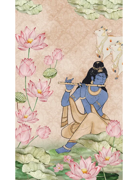 Inspired by the spiritual charm of Lord Krishna, this wallpaper is infused with mural-like detailing and gentle hues, radiating