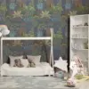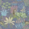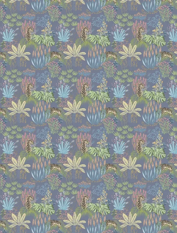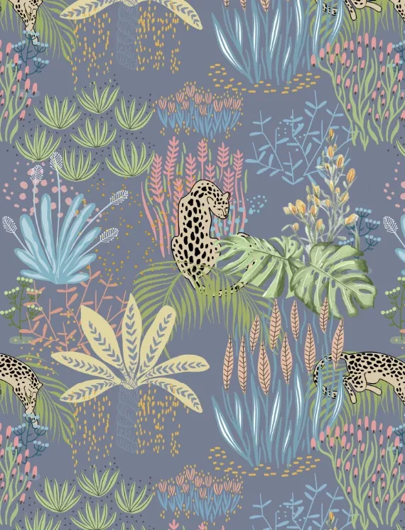 Playful leopards with elongated limbs and inky spots lounge among tropical palms and abstract shapes in calming tones of green, blue, and sand. The hand-drawn style adds a touch of whimsy, while hints of water and sky bring a breezy freshness. This wallpaper creates a vibrant, storybook safari look that feels both fun and stylish.