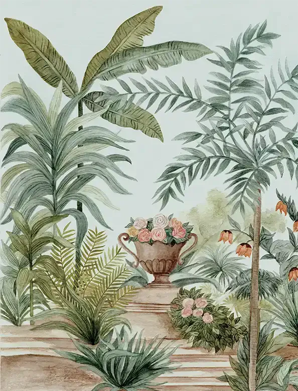 A traditional architectural scene nestled within a forested setting, where calm, ornamentation, and romance come together in a timeless composition.