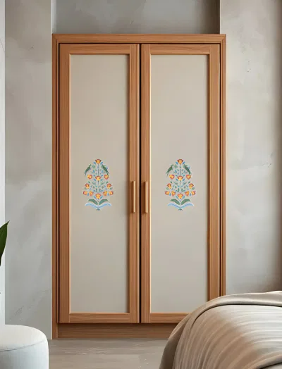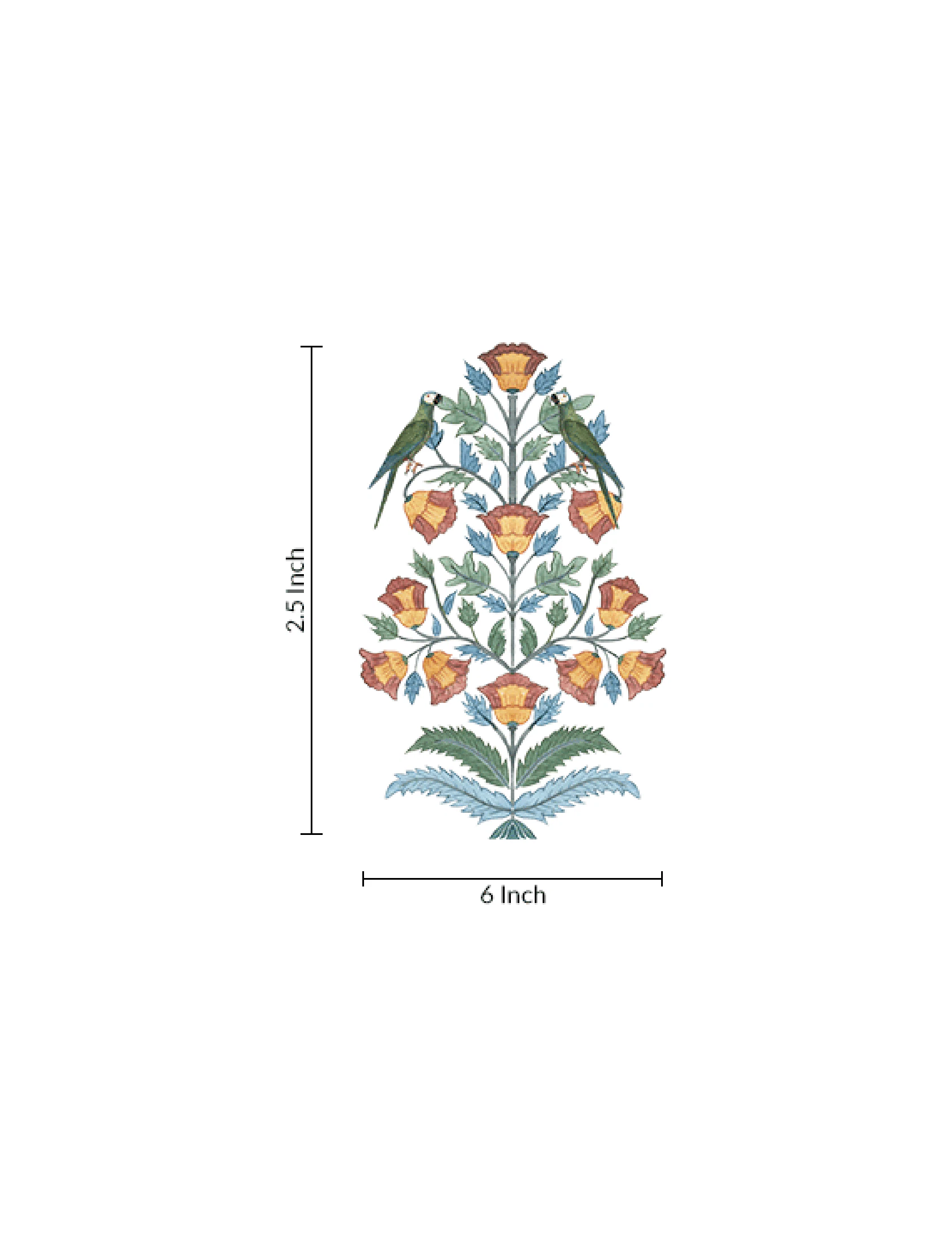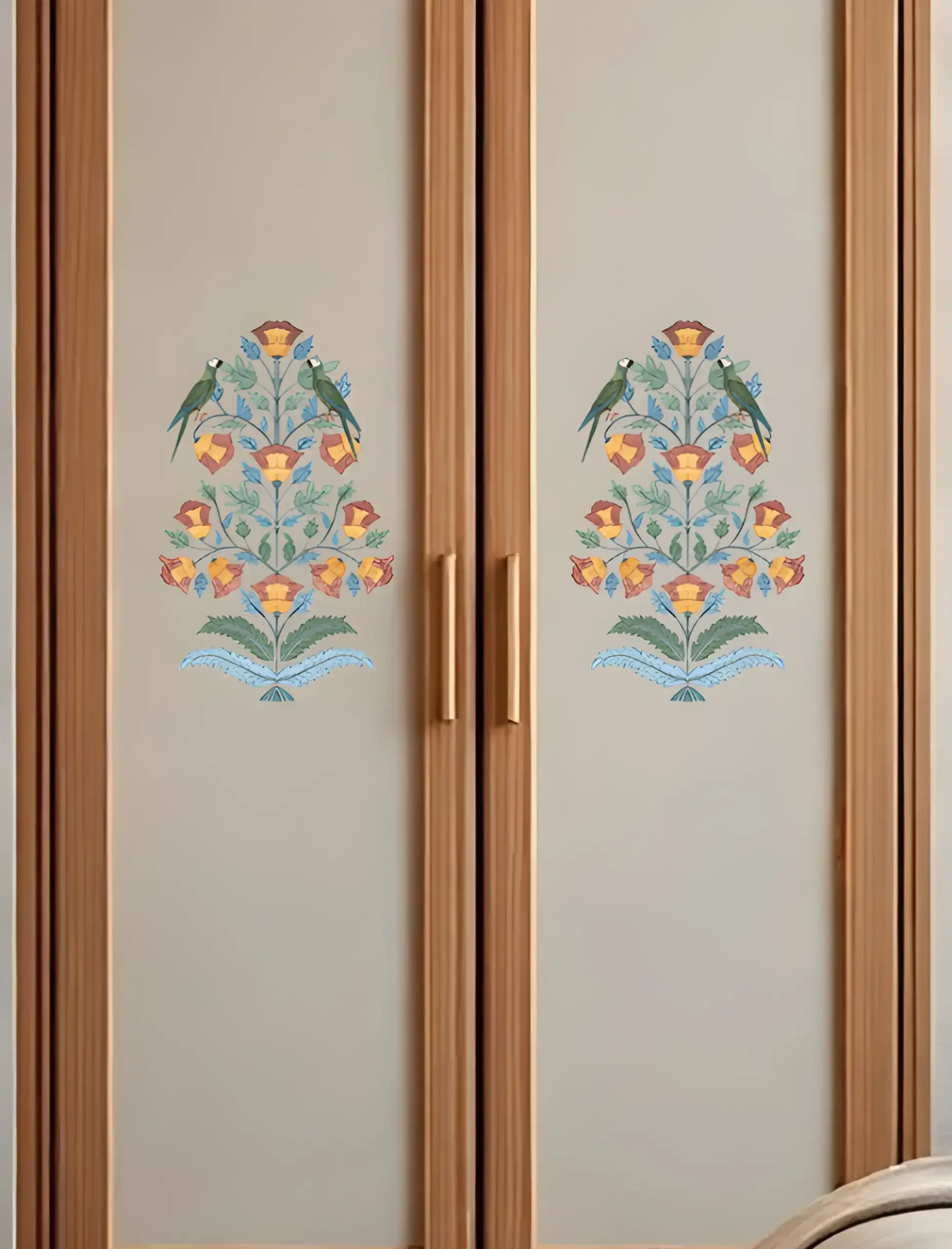 Two perched parrots amidst golden blooms and teal foliage,  this nature-rich decal channels classic garden artistry with a tropical twist.