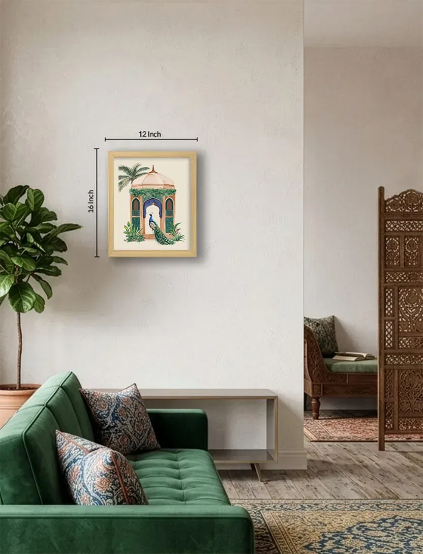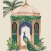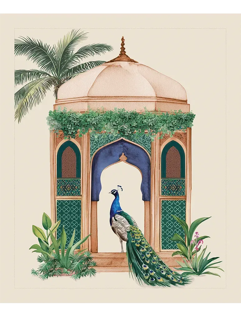 A poised peacock framed by lush greens and jharokha-style windows — this print celebrates elegance, pride, and the poetry of royal gardens.