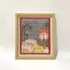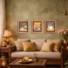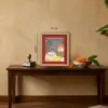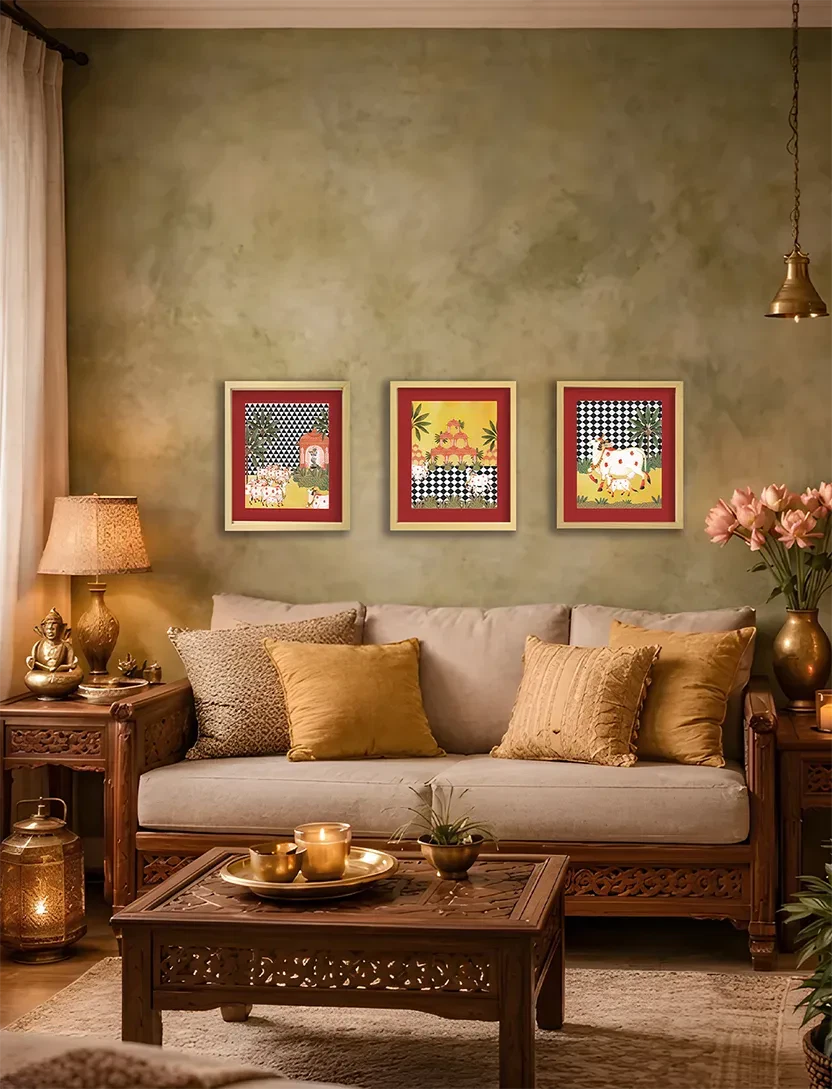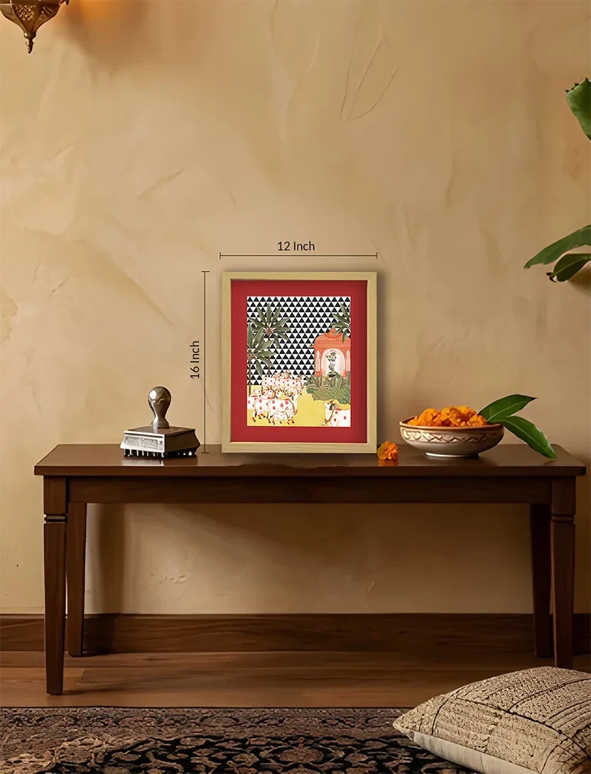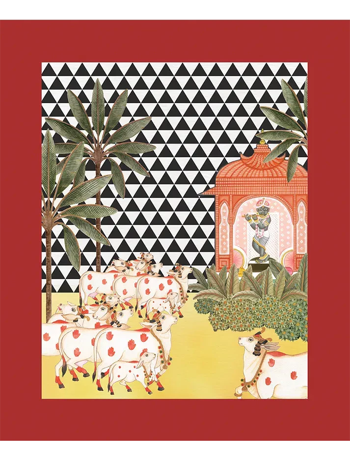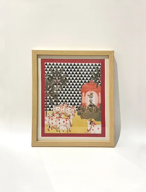 A pastoral gathering of sacred cows near a mandir, set against a vivid chequered backdrop — this framed artwork balances folklore and graphic elegance.