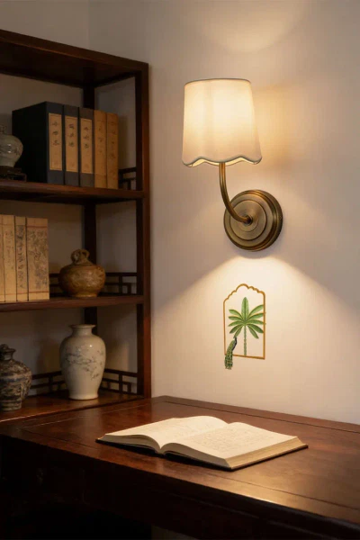A vibrant peacock stands gracefully by a tropical palm, framed in a golden arch — perfect for bringing opulence and nature indoors.