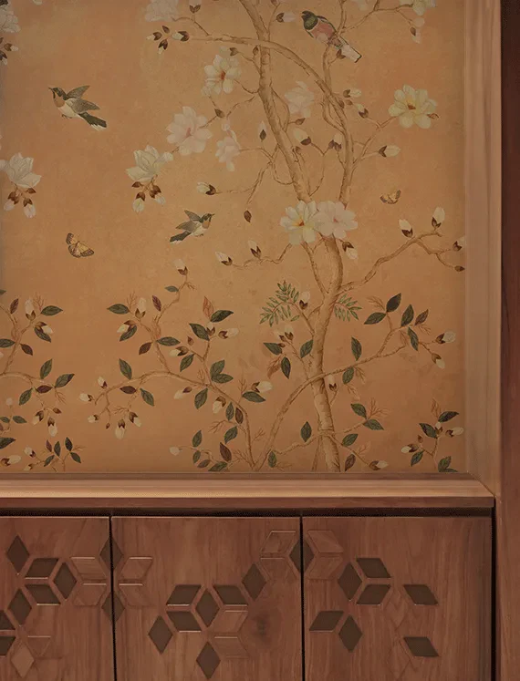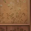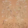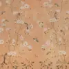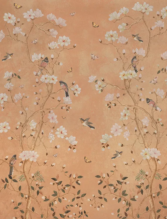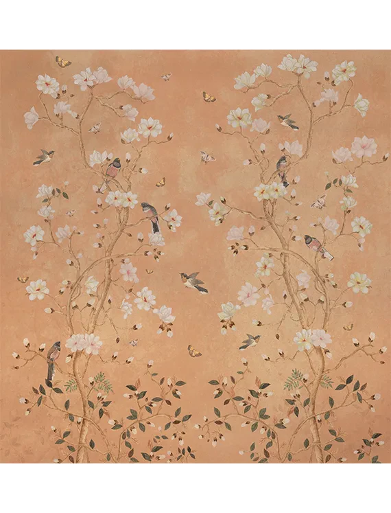 A graceful Chinoiserie composition set against a warm peach background, this wallpaper showcases blooming white flowers, fluttering butterflies, and delicate birds perched on symmetrical branches.