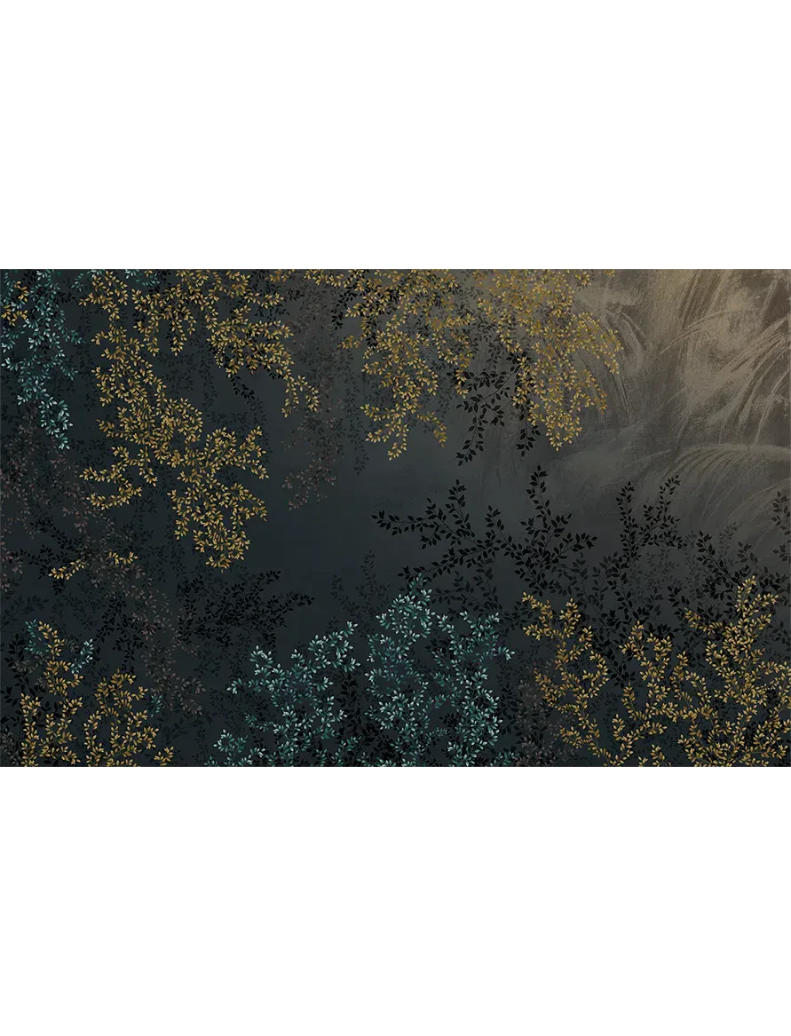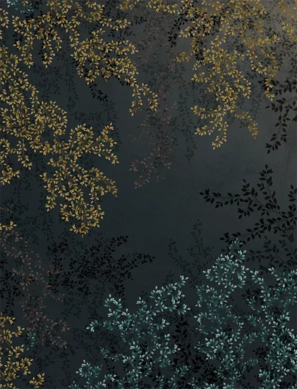 An alluring dark floral composition, subtly accented with glimmers of gold for a rich, moody feeling