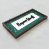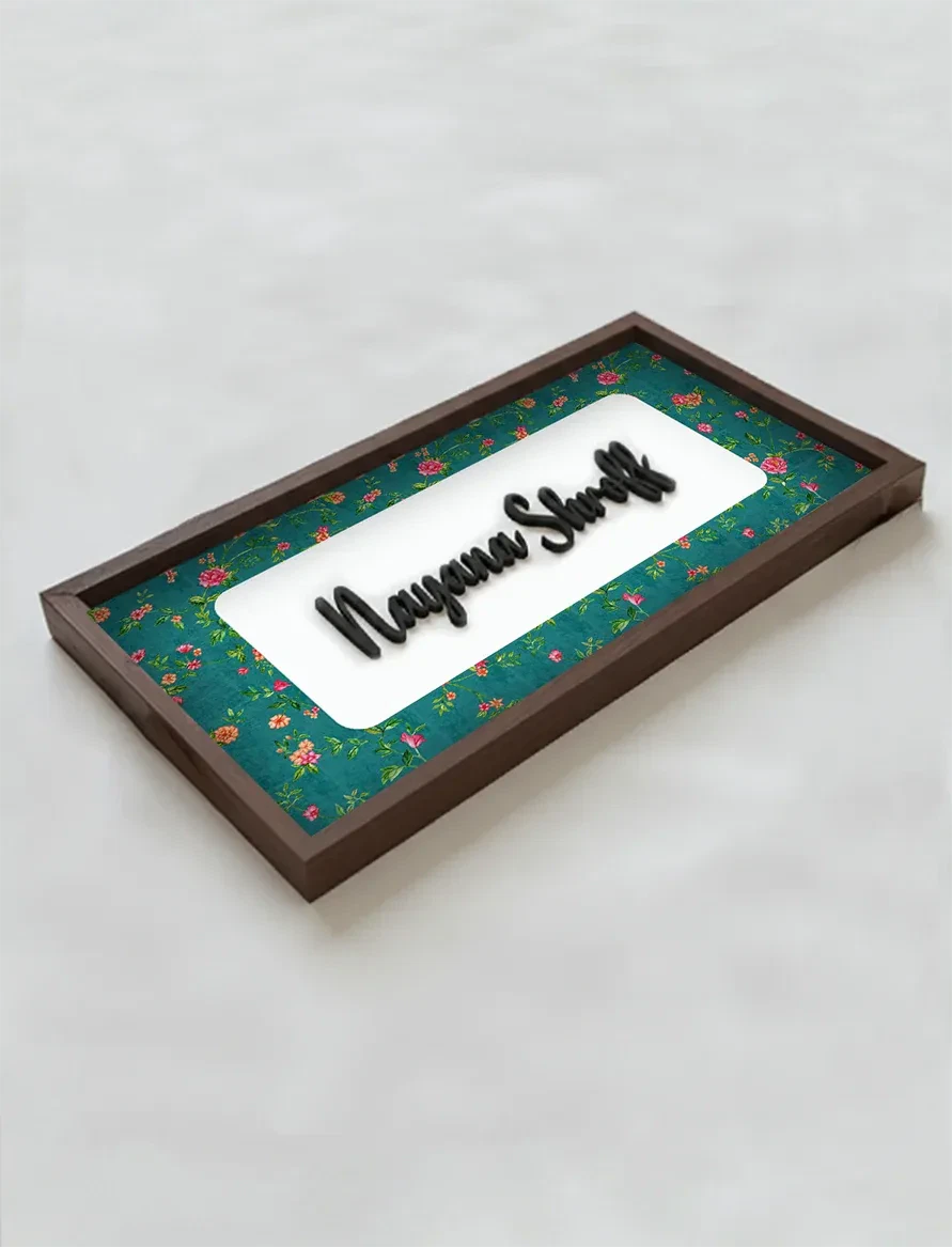 Dark teal meets blossoming coral and blush florals in this bold yet romantic nameplate. The flowers bloom vividly against a rich canvas, like a garden lit by moonlight. Vibrant and full of contrast, it’s perfect for those who love traditional Indian prints with a dramatic twist.