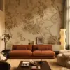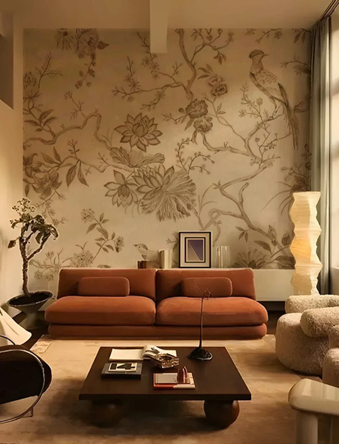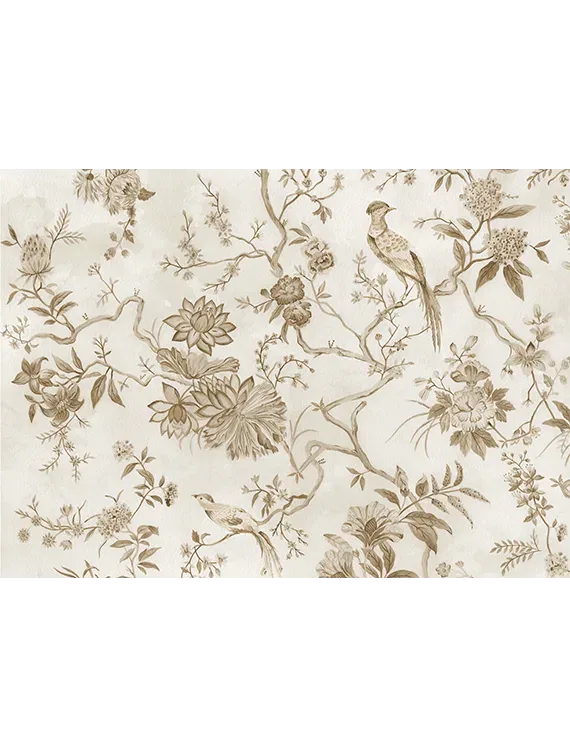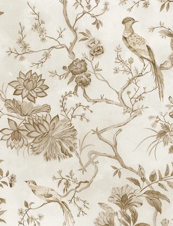 A delicate balance of nature and artistry, this wallpaper features a chinoiserie-inspired pattern in a muted palette.