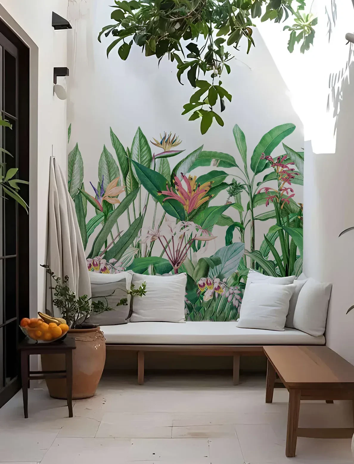 This wallpaper is a lush celebration of tropical beauty, where rich textures and colorful flora create the feeling of an exotic resort.