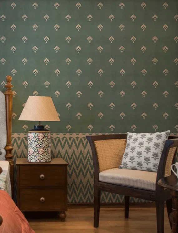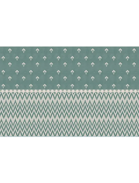 An elegant reimagining of Ikat tradition, this wallpaper showcases chevron and diamond motifs in muted blues and greens, exuding calm and cohesion.