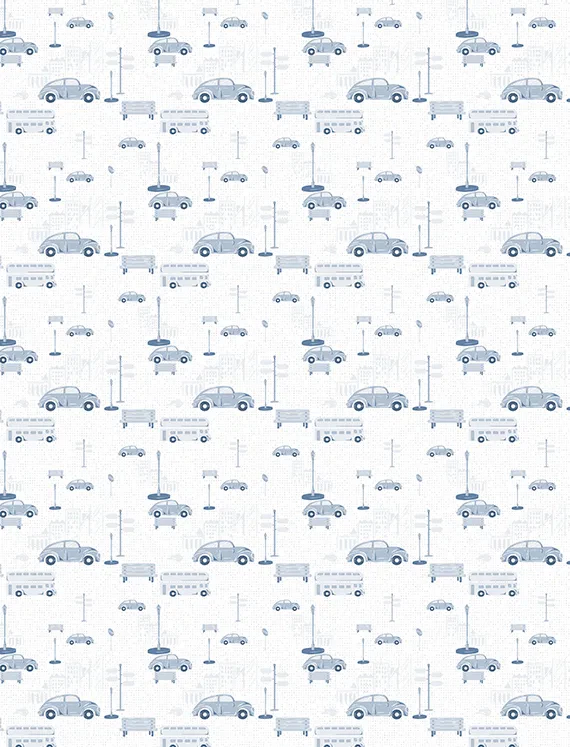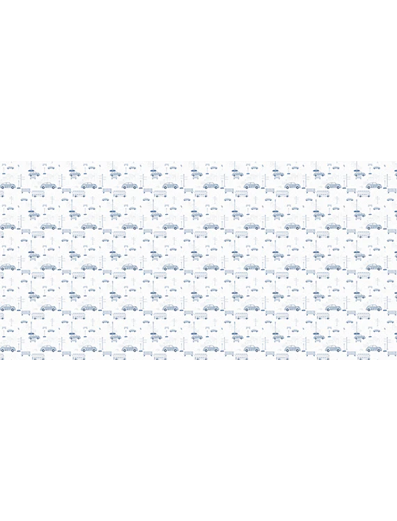 Vintage cars cruise past quaint benches and tall streetlamps in this charming, cityscape-inspired design. Soft blue tones and rounded shapes lend a gentle, nostalgic feel, while the clean spacing keeps it calm and tidy. This wallpaper adds a dreamy, retro-city vibe to any space, perfect for curious minds and peaceful playtime drives.