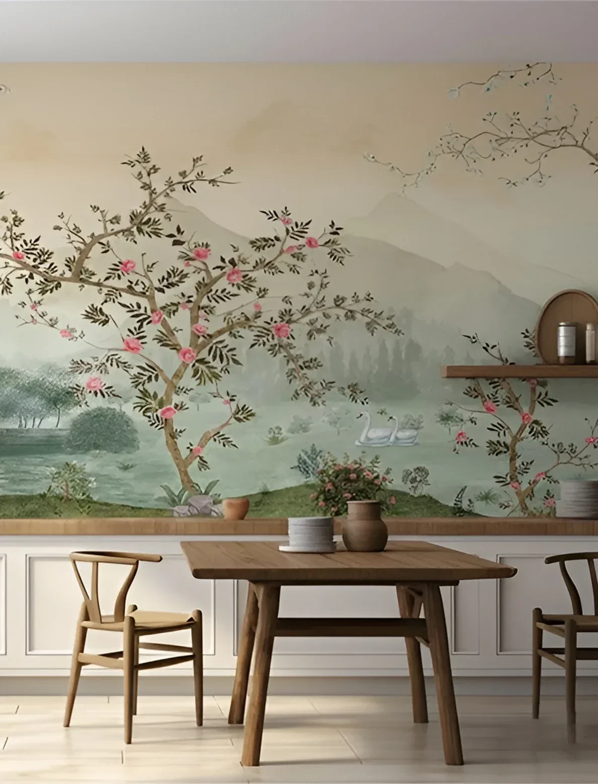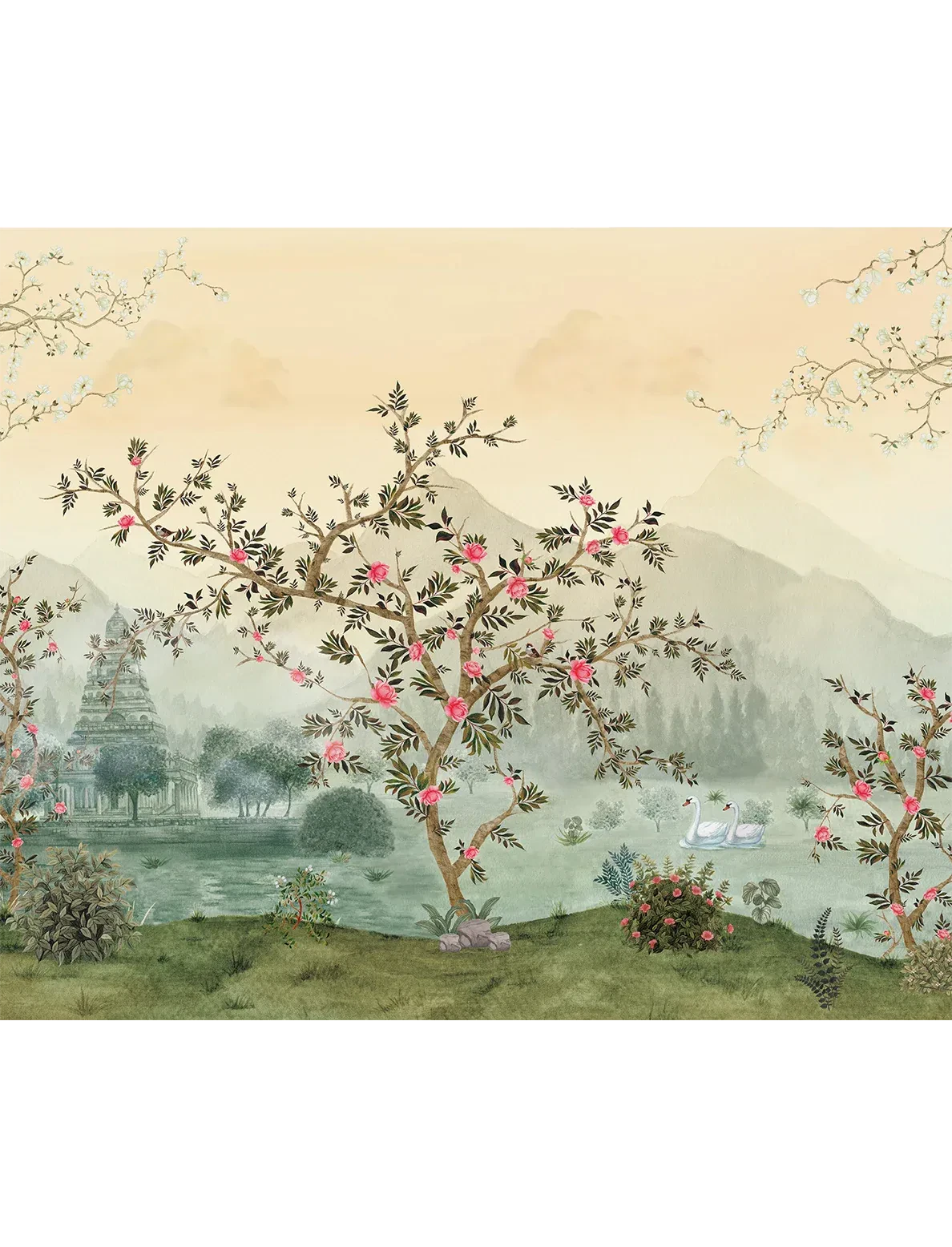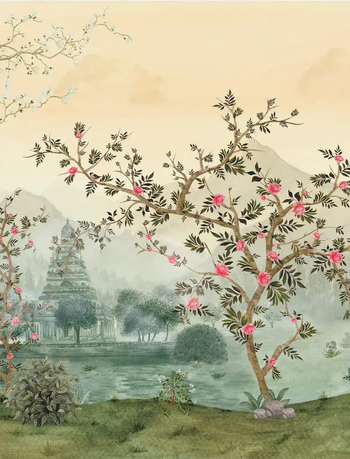 Muted sages and blush pinks creates a tranquil yet opulent composition