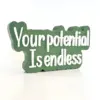 Laser-cut acrylic letters are used for a clean, modern aesthetic with a tactile dimension